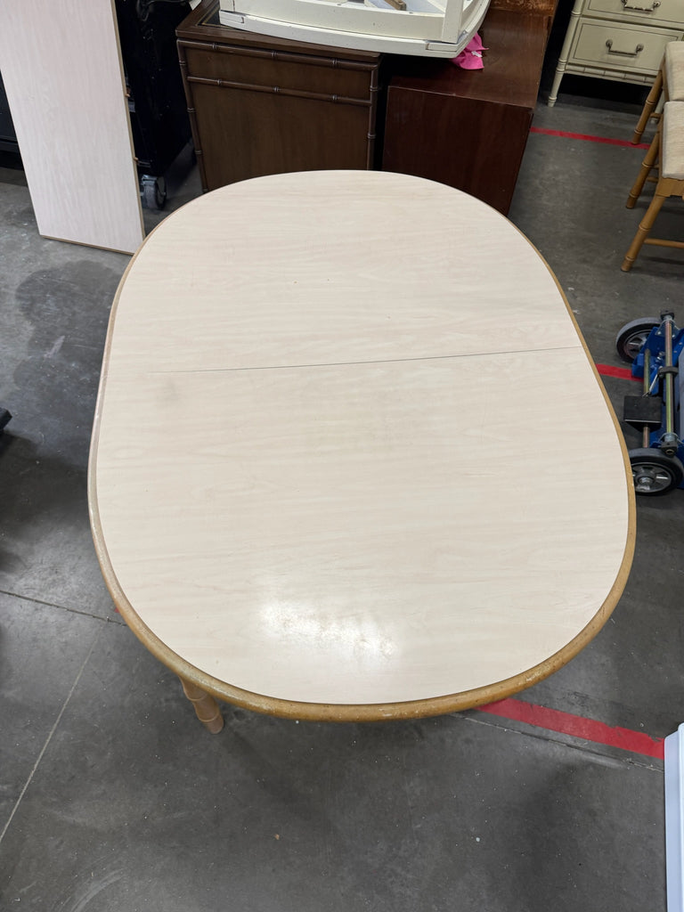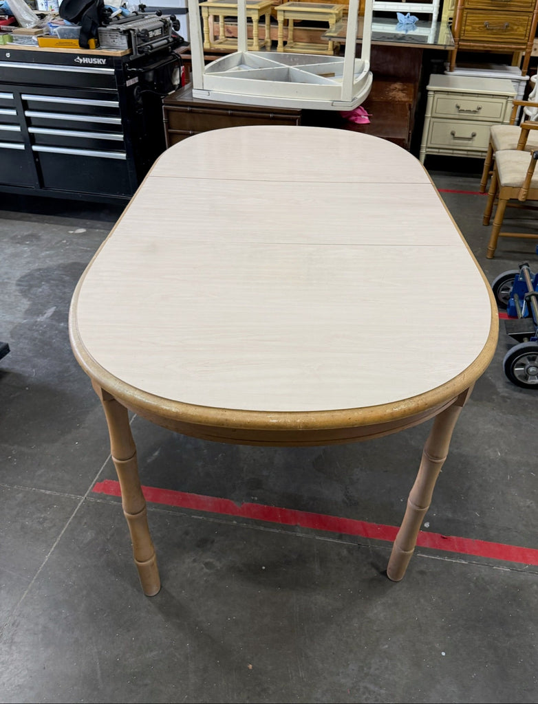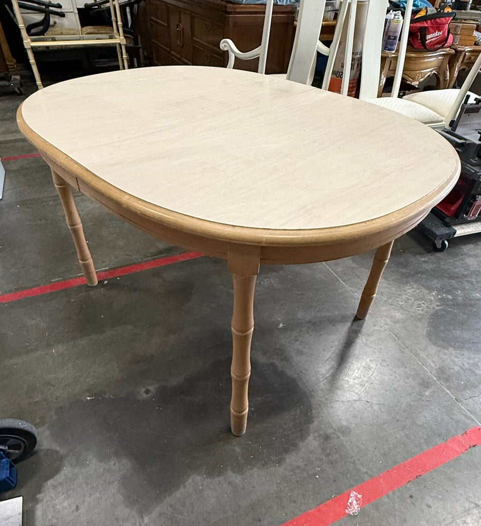 Broyhill Faux Bamboo Dining Table with Leaf Available for Custom Lacquer! // Make a statement in your dining room or breakfast nook with this fabulous Broyhill furniture faux bamboo dining table. The oblong oval shape table features faux bamboo detailing throughout. It is heavy and sturdy made of all wood. Leaf also included as pictured. Add a touch of Palm Beach chic flair to any space. This piece is currently in raw vintage condition in its original ivory finish and is available for custom high-gloss lacquer. The price includes one stock color of your choice, but a custom color can be selected for a $175 upcharge. Our painters can match any Benjamin Moore or Sherwin William’s color. Additional photos are for lacquer color inspiration. Please “note” the color of your choice during checkout. *If unsure of lacquer color you have three weeks to let us know once purchased.