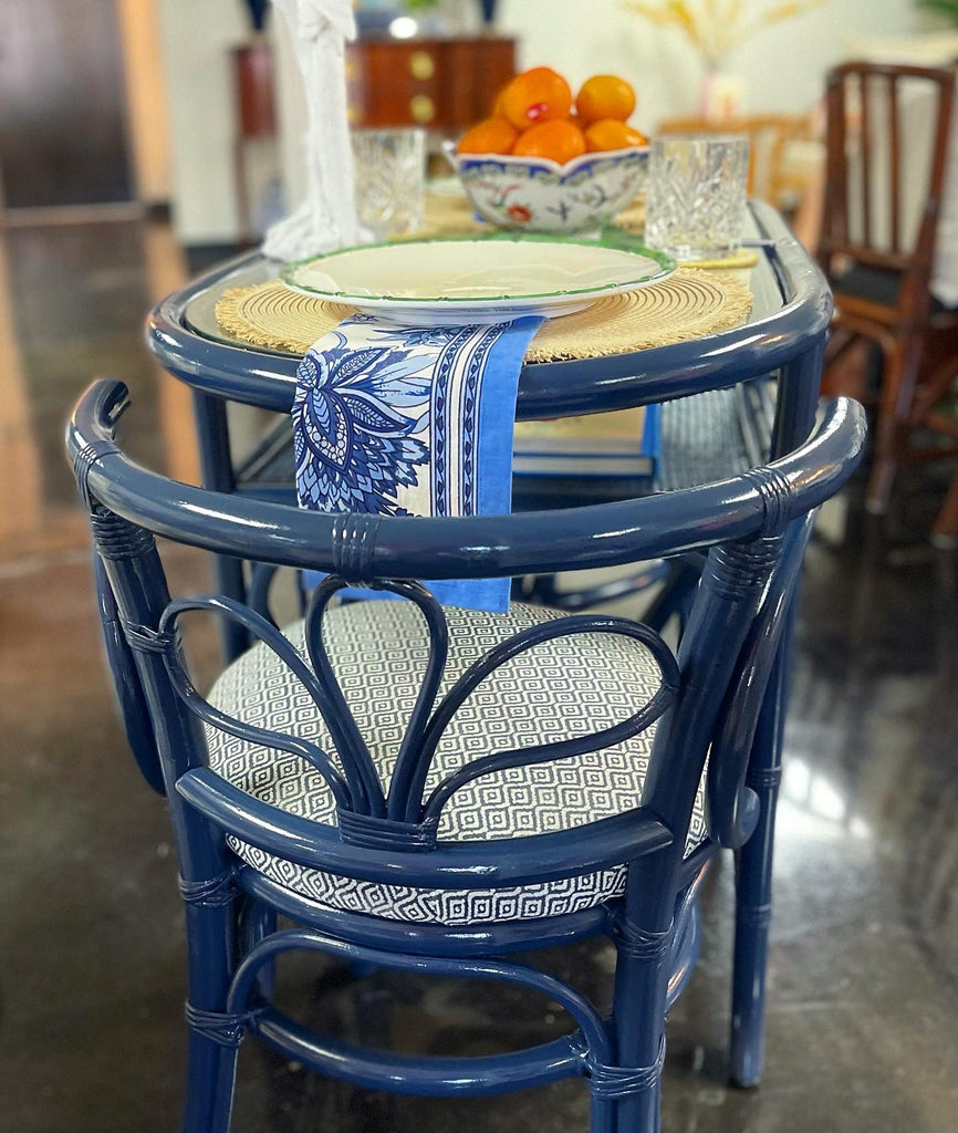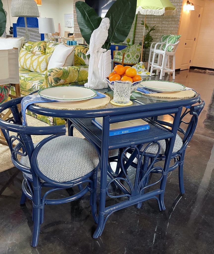 Vintage Rattan Honeymoon Table and Chairs Available for Custom Lacquer! // 1950's vintage wicker faux bamboo honeymoon bistro table dinette set. An adorable unique little breakfast or “chat” table set with a single piece of smoked glass atop a faux bamboo base. The chairs push all the way under the piece to make a petite grouping that takes up minimal space and cozy seating for two lending itself to the name “honeymoon” set. The truly unique design is sturdy and functional. Use in a small space such as a balcony, bay window, or apartment! This set is in its original vintage condition with original fabric still on the chair cushions but could easily be recovered should you desire once the set arrives to your home. One stock lacquer color is included in the price of the piece. A custom color can be selected for a $175 uncharge. Our painters can match any Benjamin Moore or Sherwin Williams color. Additional photos are for lacquer inspiration. Please note your color choice at checkout should you know it or within three weeks of purchase.