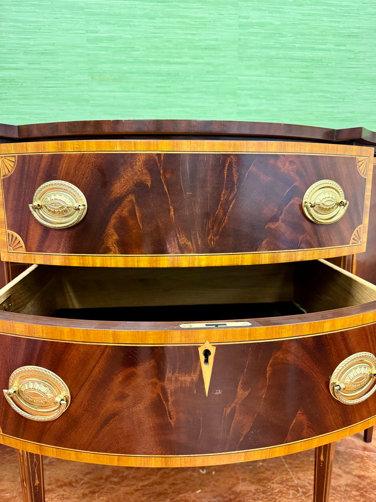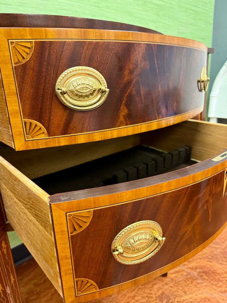Gorgeous Council Craftsman Federal Style Hepplewhite Sideboard Available & Ready to Ship// Absolutely stunning traditional Hepplewhite style sideboard by Council Craftsman is available and ready to ship. This gorgeous antique federal style sideboard is made of all mahogany wood, dovetailed joints and drawers and beautiful inlaid details throughout. Inlaid floral design intricately decorates the case columns and end with a satinwood cuff on the lower tapered leg. The two outside locking doors reveal ample open storage. The top drawer contains a soft silverware liner to store your fine silver flatware. Gorgeous all original brass hardware in fabulous shape. Pristine vintage condition throughout the piece- definition of fabulous meets function! Would be stunning in a dining room, entry way or living space. Little to zero signs of wear. This classically stunning statement piece is available and ready to ship from our South Florida shop!