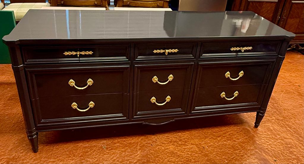 National Mount Airy Vintage Nine Drawer Traditional Style Dresser Lacquered in Benjamin Moore's HC-190 "Black" Available and Ready to Ship! // Beautiful nine drawer traditional style dresser by Mt. Airy Furniture Company. This all-wood dresser has been professionally lacquered in High Gloss Benjamin Moore's HC-190 Black. It features original hardware with chic ornate backplates and handles all that have been sprayed in our stock gloss gold. Dovetailed drawer and joints and being all wood makes this piece extremely heavy, durable and such a quality vintage gem. Three narrow drawers in the middle are flanked by two sets of three larger drawers for ultimate storage. Goreous tapered legs. The traditional design makes it functional in a variety of spaces in nay style home. Such a glamorous and chic piece for a bedroom, living space or even dining room! This beauty is available and Ready to Ship from our Florida lacquer shop!