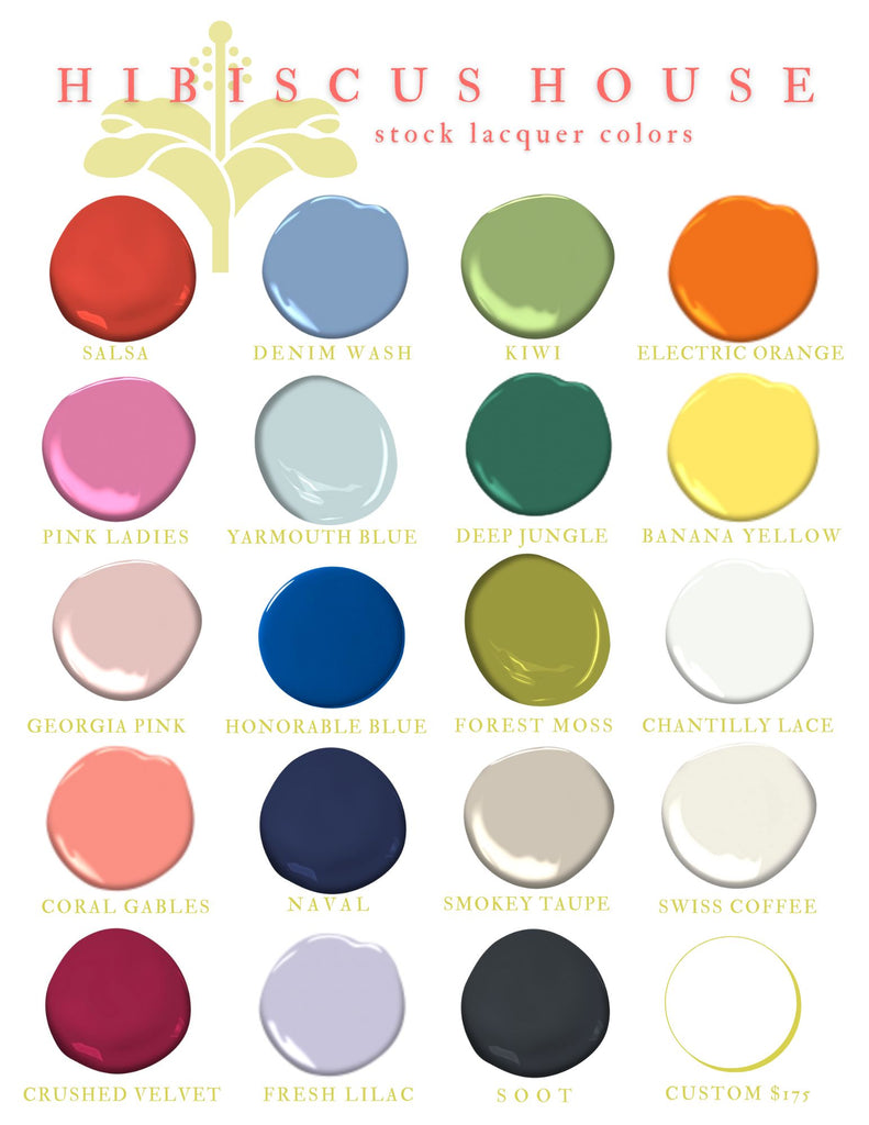 We know it's difficult to decide COLOR! If you are certain you'd like a piece, but need some time to decide your lacquer color, go ahead and purchase the item so it doesn't get away from you and it’ll reserve your place in our paint line! Please let us know your color choice within three weeks of purchase. If it takes longer than three weeks to select you color your lead time will begin based on the date paint color is submitted in order to keep our operations in Florida on track. We recommend picking up paint swatches from your local paint store to see a color in your home if you’re unsure of a shade! Lighting in individual homes can impact the way the color appears.
