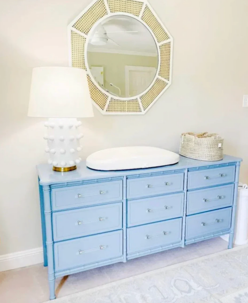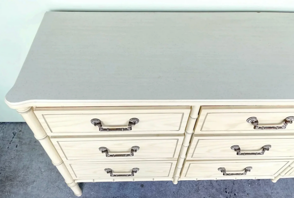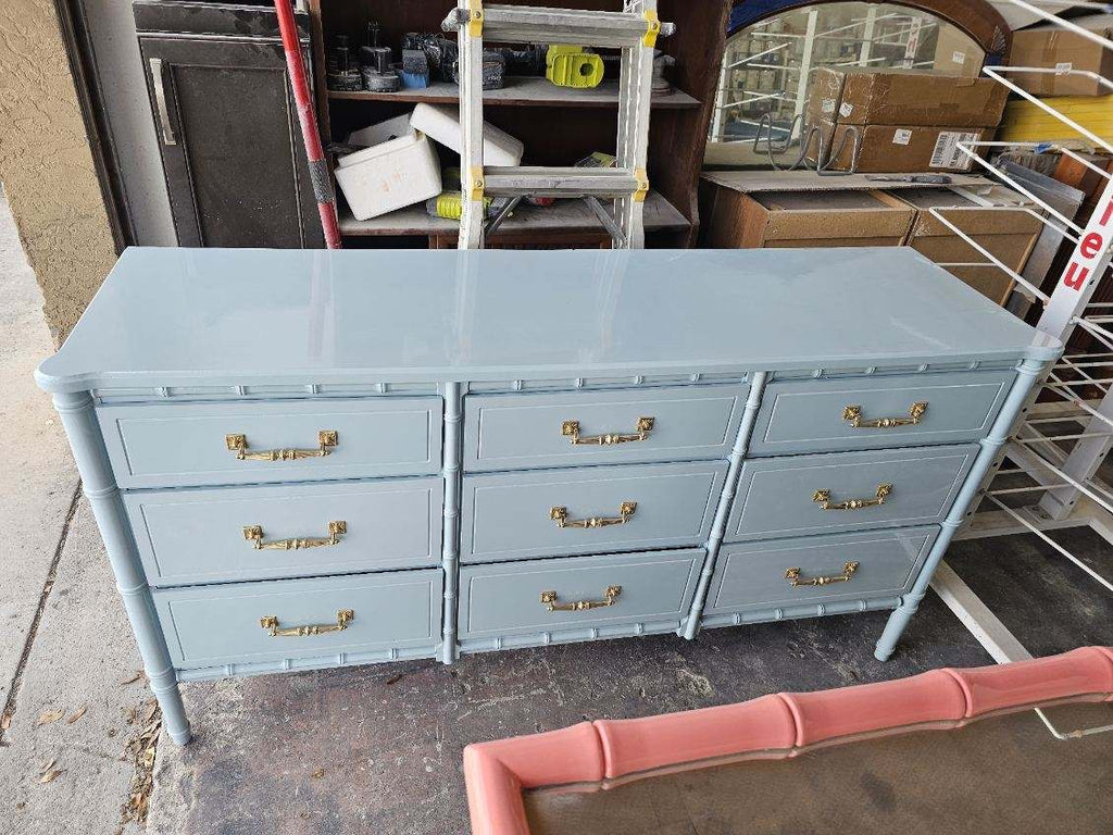 Vintage Faux Bamboo Nine Drawer Triple Dresser Available for Custom Lacquer// 1960's Faux Bamboo Triple Classic Dresser by Florida Furniture Co. Palm Beach Regency style at its finest! Nine drawer classic dresser with straight Bali Hai style brass hardware which will be painted in our gloss gold. All drawers slide beautifully! This piece is in gorgeous raw vintage condition and available for custom lacquer. Price includes one stock lacquer color choice. The additional photos are photos of previous pieces we’ve done for clients for lacquer inspiration to see how this beautiful piece is transformed! Use this piece as a dresser, credenza, buffet and so much more- the most perfect changing table for expecting Mommas! Additional photos are for lacquer inspiration. Price includes one STOCK lacquer color of choice or you may choose any custom color for $175 upcharge. Please note custom color in the notes section at checkout. *If you are unsure of color, you have three weeks to decide once purchased!