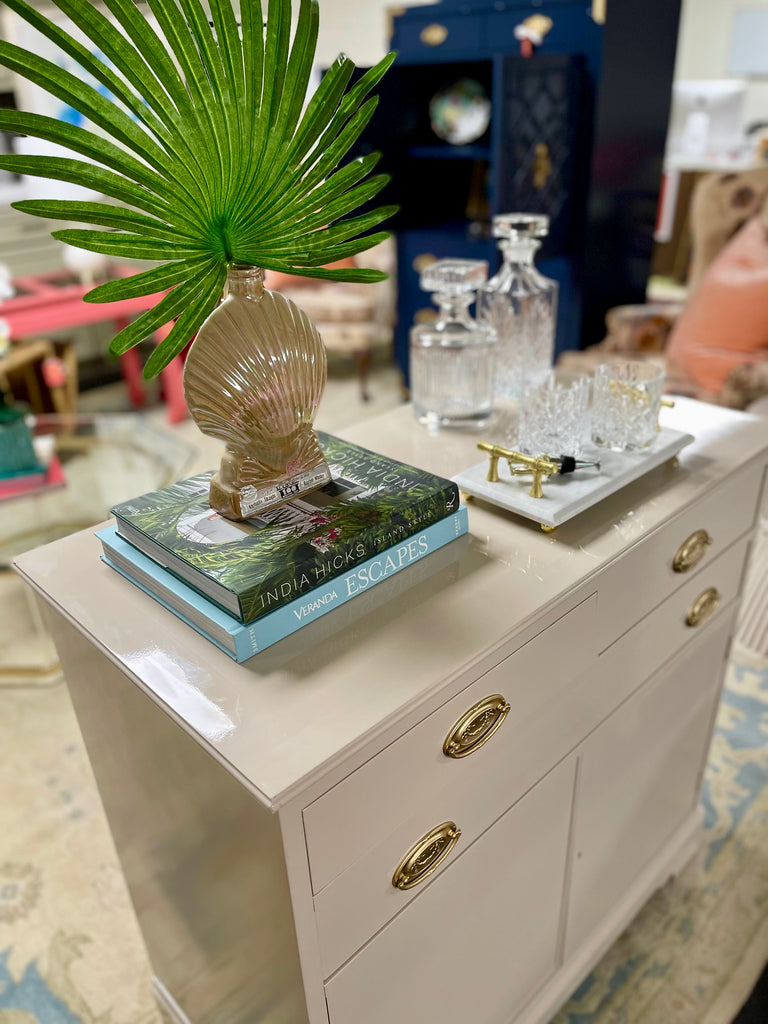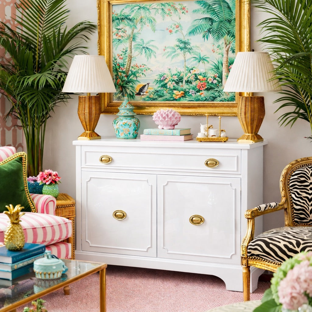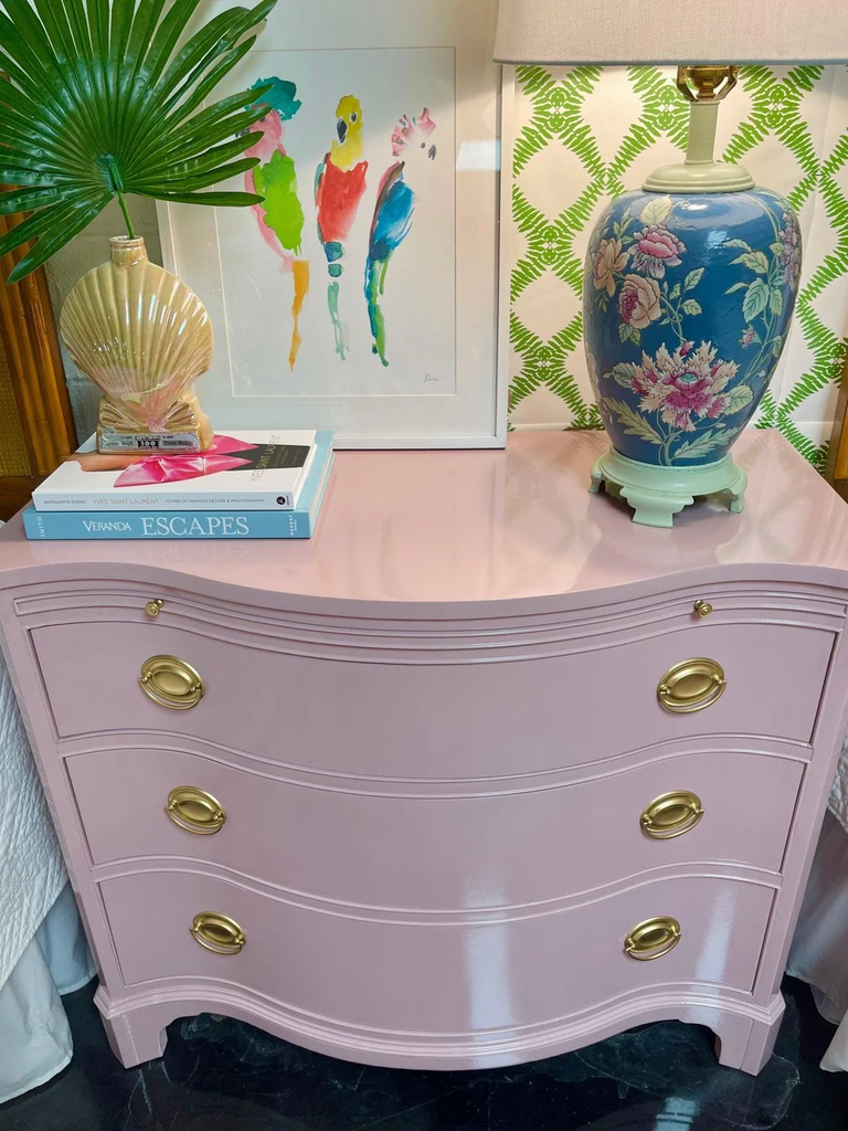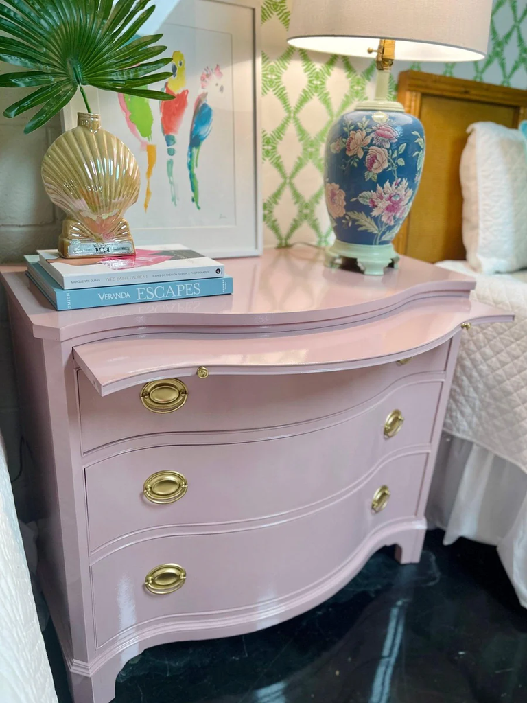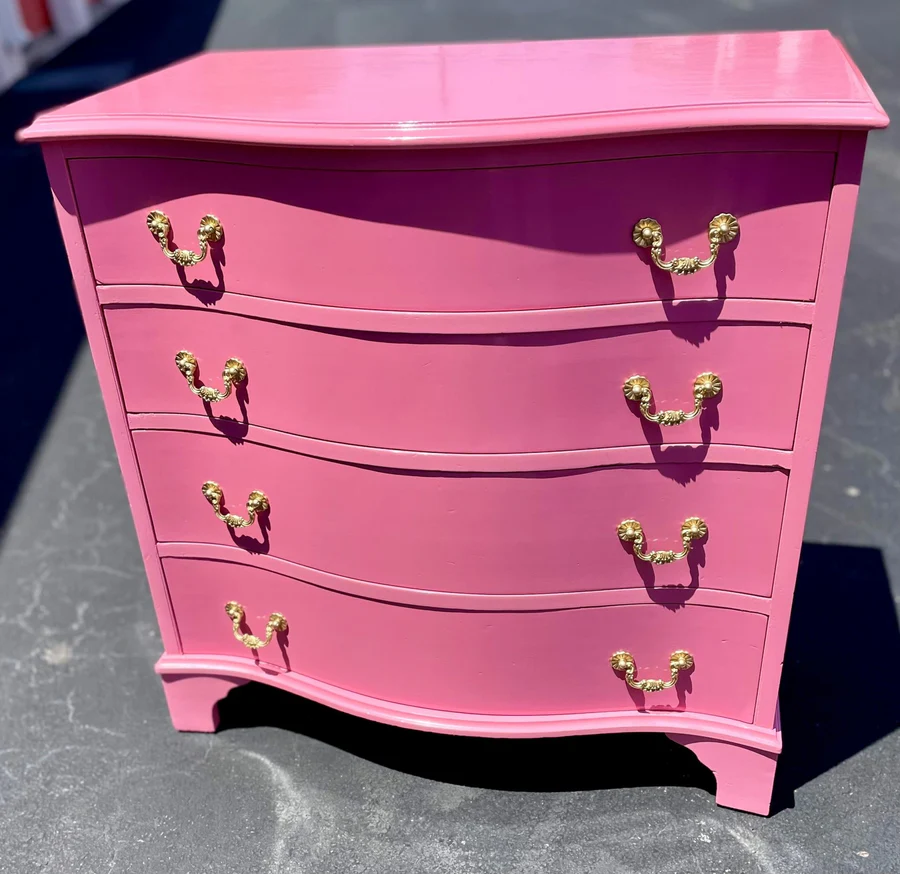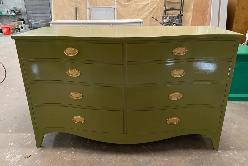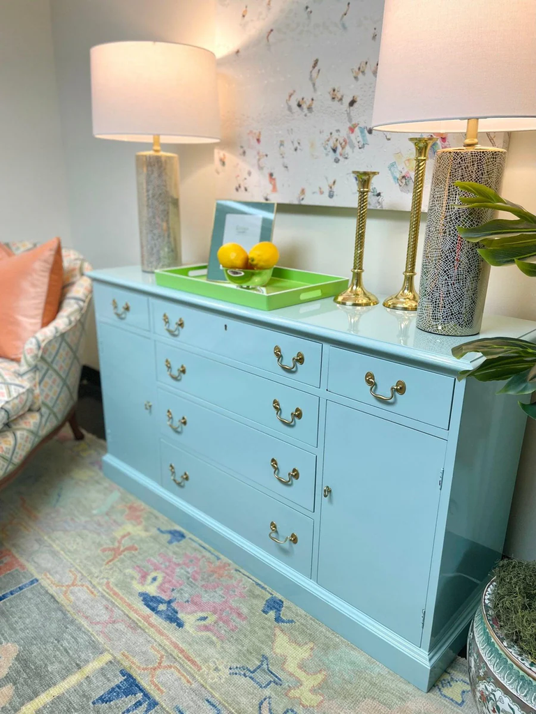 This piece is currently in vintage condition and will be professionally refinished in high gloss lacquer. The price includes one of our stock lacquer colors. Our professional painters use a quality, high- gloss customized lacquer to transform these fabulous vintage pieces. If you would like custom color, please add the "custom color" product to your cart and "note" your Benjamin Moore or Sherwin Williams color code in the notes section upon checkout ($175 upcharge). Please type your color choice in the “note” section found beneath the piece on the left hand side on the cart checkout page should you know it or respond to our thank you email with your choice within 3 weeks to keep your spot in our paint queue. If you give color after 3 weeks your paint lead time begins when color is given. We MUST have color within one year of purchase or we reserve the right to sell your items due to shop storage but a credit would remain on your account. All original hardware will be painted in gloss gold unless specifically requested by the client or the product descriptions says it's eligible for lucite.