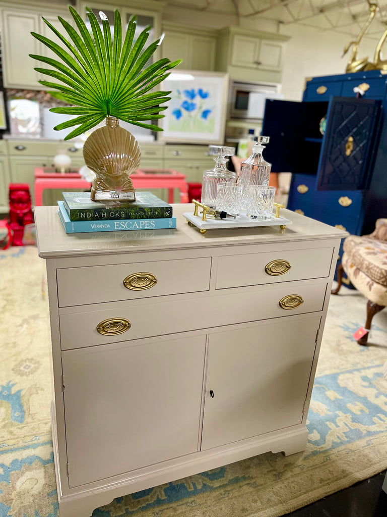1940's Traditional Style Mahogany Serving Chest Available for Custom Lacquer // Gorgeous vintage Duncan Phyfe style traditional chest featuring all mahogany wood, dovetailed joints and drawers and ornate original brass hardware which will be painted in our stock gold! Cabinet storage doors open to reveal one shelf for a perfect amount of space for linens, serving pieces or anything your heart desires. Additionally one pull out top drawer for additional function and storage space. Use this adorable perfectly sized piece in nearly any style home; entry way, bedroom or living area! This chest is raw and available for custom lacquer of choice! Stock lacquer color included in price of piece, please note your lacquer color in the notes section upon checkout, or let us know within three weeks of purchase! Additional photos are of similar traditional style pieces for lacquer color inspiration!