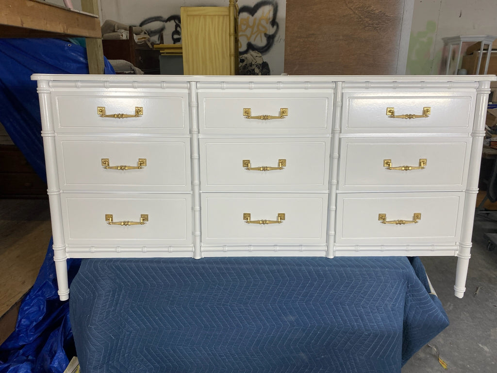 Vintage Faux Bamboo Nine Drawer Triple Dresser Available for Custom Lacquer// 1960's Faux Bamboo Triple Classic Dresser by Florida Furniture Co. Palm Beach Regency style at its finest! Nine drawer classic dresser with swing Bali Hai style brass hardware which will be painted in our gloss gold. All drawers slide beautifully! This piece is in gorgeous raw vintage condition and available for custom lacquer. Price includes one stock lacquer color choice. The additional photos are photos of previous pieces we’ve done for clients for lacquer inspiration to see how this beautiful piece is transformed! Use this piece as a dresser, credenza, buffet and so much more- the most perfect changing table for expecting Mommas! Additional photos are for lacquer inspiration. Price includes one STOCK lacquer color of choice or you may choose any custom color for $175 upcharge. Please note custom color in the notes section at checkout. *If you are unsure of color, you have three weeks to decide once purchased!
