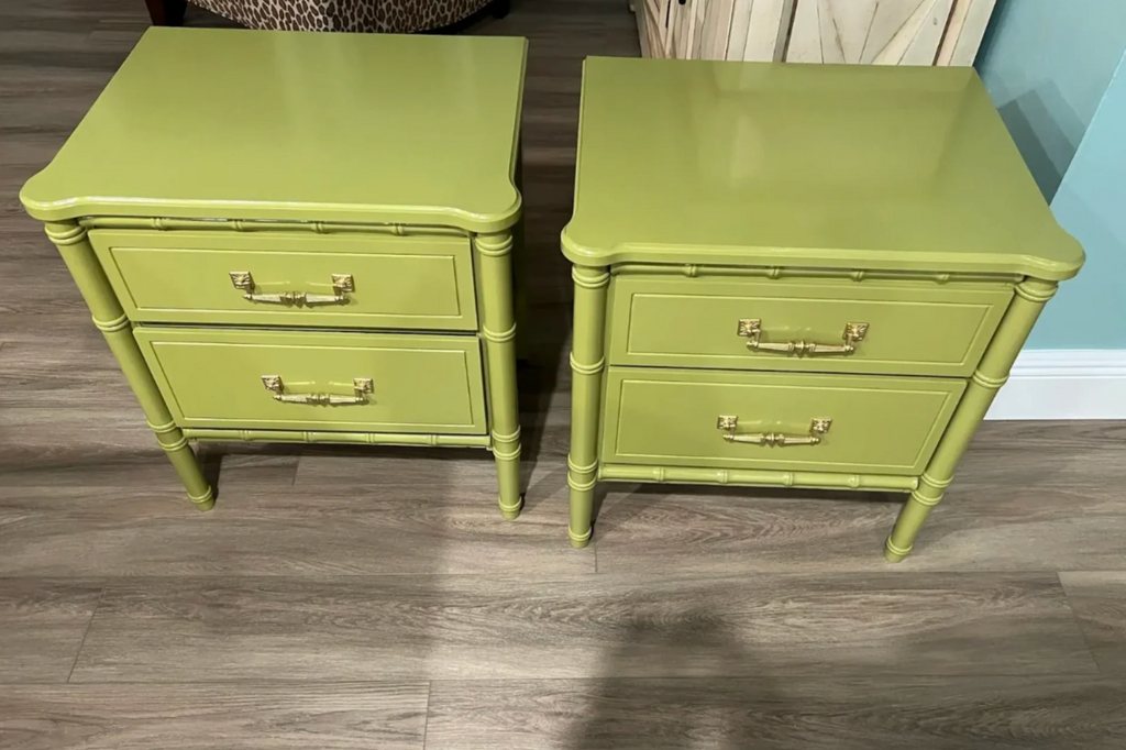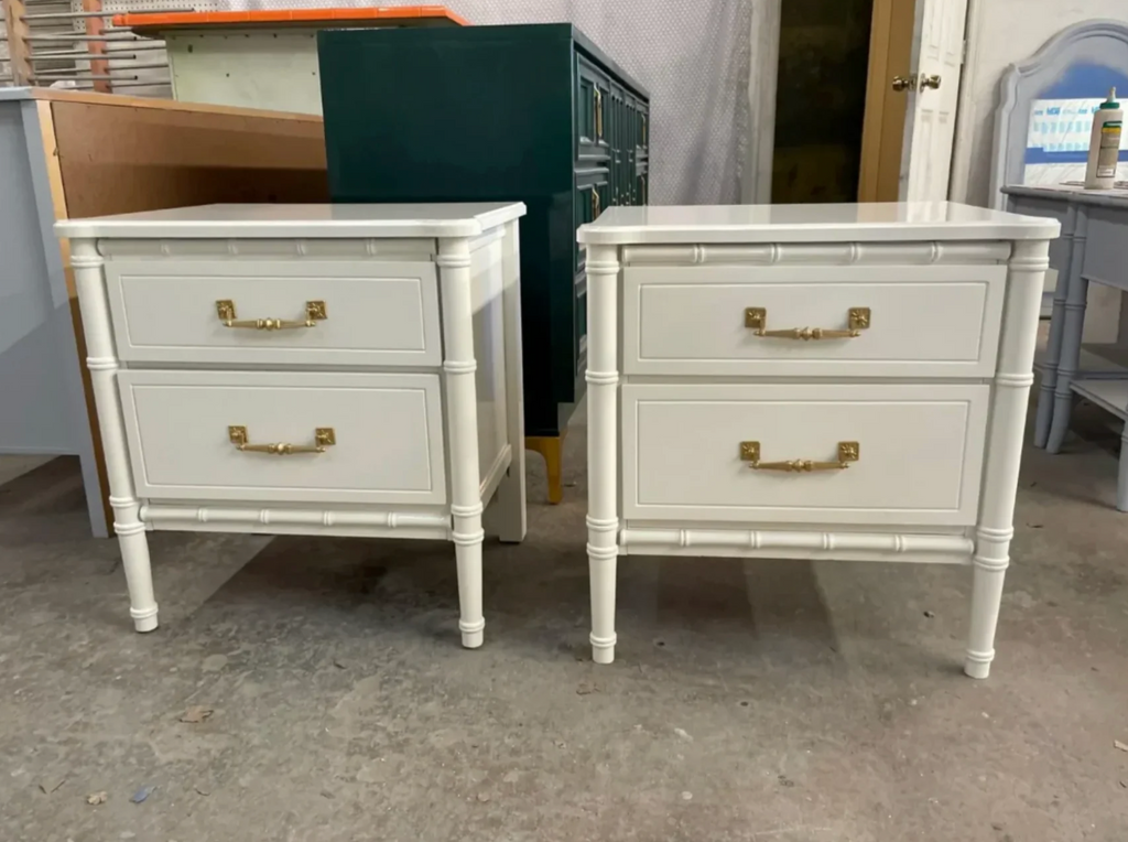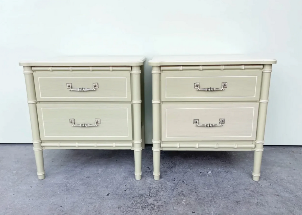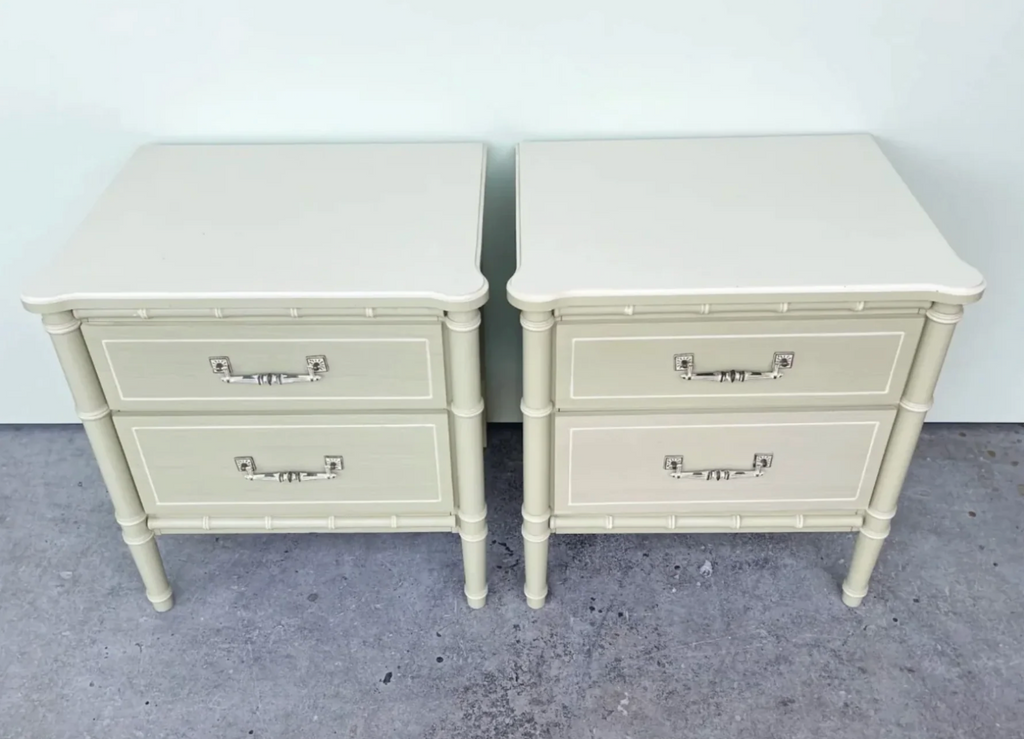 Pair of Classic Vintage Faux Bamboo Nightstands Available for Custom Lacquer! // Perfect, versatile pair of faux bamboo vintage nightstands with fretwork detailing and original Henry Link style brass swing hardware which will be painted in our stock gloss gold. The pair is in great vintage condition, drawers slide exceptionally well! Use these as end tables or nightstands for a fun pop of color in any room! These are currently raw in their original finish. Additional photos are for lacquer inspiration. Price includes one STOCK lacquer color of choice or you may choose any custom color for $175 upcharge. Our painters prefer Benjamin Moore of Sherwin Williams. Please note custom color in the notes section at checkout. *If you are unsure of your lacquer color, you have up to three weeks to decide once purchased!