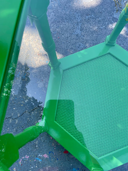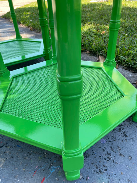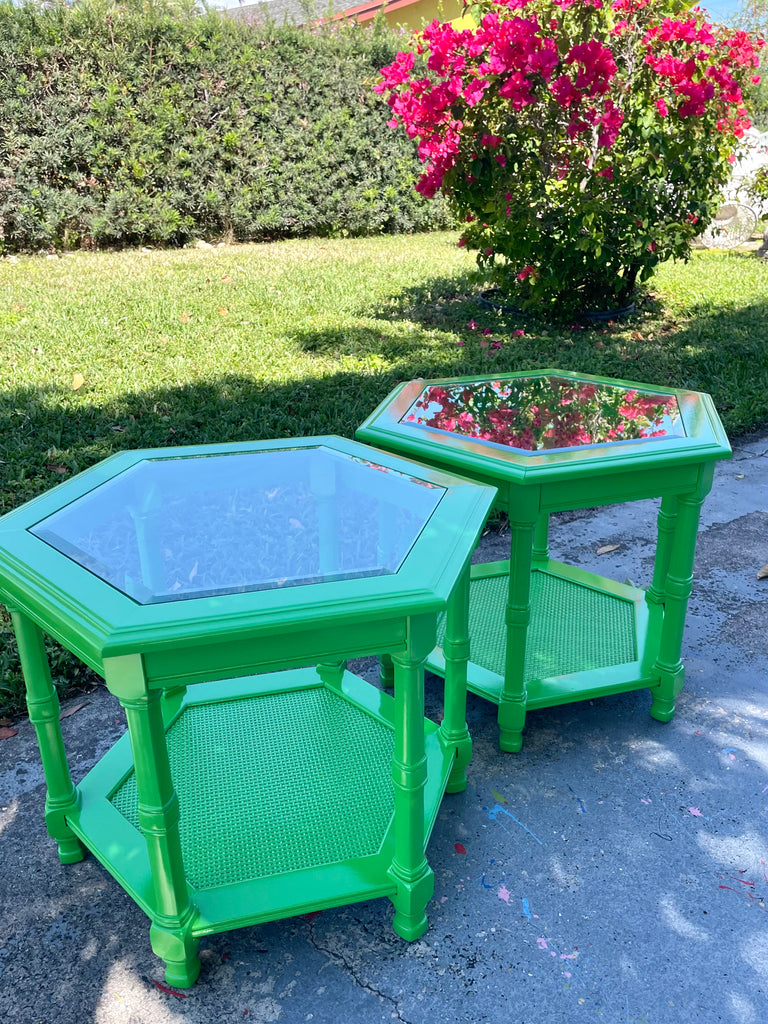 1970s Mersman Hexagonal Solid Wood Cane Beveled Glass Side/End Tables Lacquered Ready to Ship!// This adorable vintage pair of Mersman Furniture hexagonal shaped end tables or side tables have beveled glass tops and cane shelf lined bases. They are solid mahogany wood and made circa 1970s in the USA! The faux bamboo details offer the perfect amount of Palm Beach regency flair for any style room. This cute pair has been professionally high glossed lacquered in "Lizard Green" by Benjamin Moore. Use in a living space or bedroom for a fun pop color. The bottom shelf makes it perfect to display and store pretty books, trinkets etc. They are available and ready to ship from our South Florida warehouse!