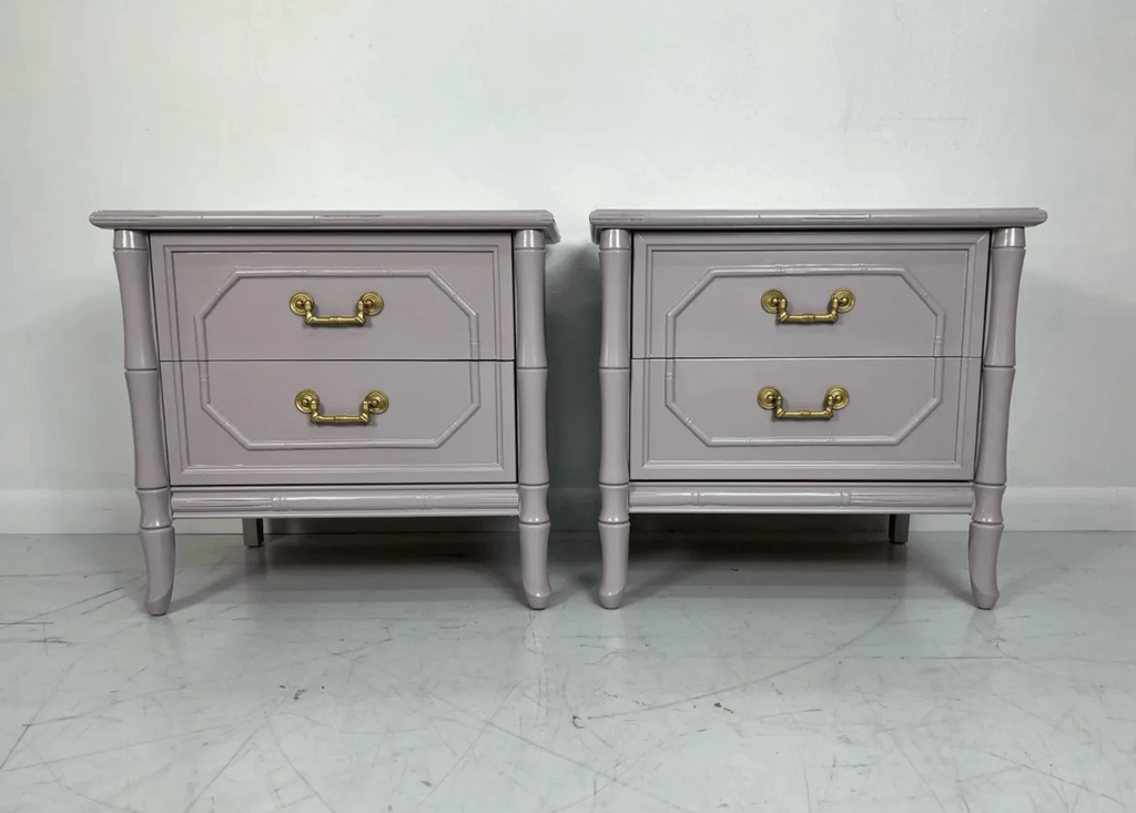Pair of Vintage Broyhill Furniture Faux Bamboo Nightstands Available for Custom Lacquer! // Super cute pair of vintage faux bamboo nightstands manufactured by Broyhill Furniture are available for custom lacquer! All wood with dovetailed drawers and joints and original brass faux bamboo drawer pulls give a gorgeous detail of Hollywood regency hardware will be painted in gloss gold. Use these at nightstands or end tables in any living space or bedroom for a fun pop of color! Two spacious drawers for ultimate storage! These are in raw condition and are available for custom lacquer! Additional photos are for lacquer inspiration. One stock lacquer color is included in price of nightstand pair. Please "note" your lacquer color at checkout. **If unsure of lacquer color, you have up to 3 weeks to decide once purchased!