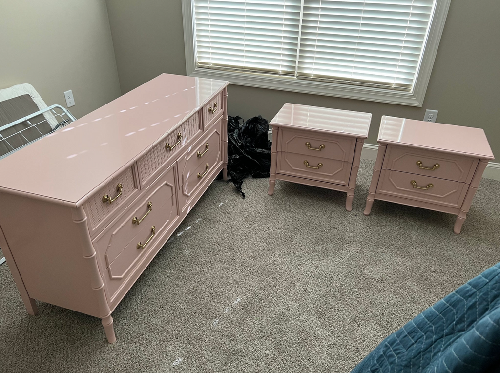 This piece is currently in vintage condition and will be professionally refinished in high gloss lacquer. The price includes one of our stock lacquer colors. Our professional painters use a quality, high- gloss customized lacquer to transform these fabulous vintage pieces. If you would like custom color, please add the "custom color" product to your cart and "note" your Benjamin Moore or Sherwin Williams color code in the notes section upon checkout ($175 upcharge). Please type your color choice in the “note” section found beneath the piece on the left hand side on the cart checkout page should you know it or respond to our thank you email with your choice within 3 weeks to keep your spot in our paint queue. All original hardware will be painted in gloss gold unless specifically requested by the client or the product descriptions says it's eligible for lucite.