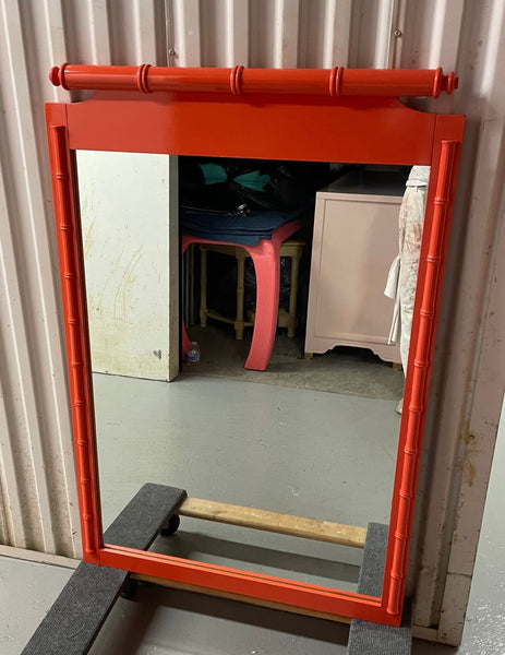 Pair of Vintage Faux Bamboo Classic Mirrors Available for Lacquer// 1960's Henry Link style Hollywood Regency mirrors are available and ready for lacquer! Pair of fabulous wooden mirrors in the style of Henry Link. These mirrors are the perfect statement piece for any bathroom, entry way or bedroom! The chinoiserie style with pagoda post is such a classic design and looks beautiful lacquered. These mirror are in raw condition and available for custom lacquer! Additional photos are for lacquer inspiration. One stock lacquer color included in price. Please note your color selection in the "notes" section upon checkout. All mirrors must be painted in a stock lacquer color. Please reference our stock color sheet when making your lacquer color choice.