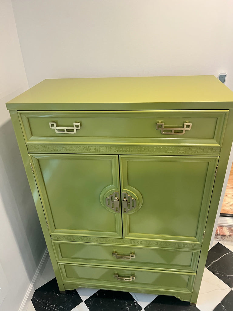 Vintage Thomasville Huntley Faux Bamboo Large Armoire Available for Custom Lacquer! // 1960's Vintage Thomasville Furniture Huntley Collection Tall Chest of Drawers. This gorgeous Palm Beach Regency Chippendale style chest made by Thomasville Furniture is part of their "Huntley" line. All wood, dovetailed joints, and fabulous brass chinoiserie accents which will be painted in our stock gloss gold. This chest features four drawers and two doors with an interior shelf behind the doos. Use this piece as a fabulous storage piece in any bedroom, fun bar, office piece and so much more! Such a stunning statement piece with impeccable for height for vintage. This armoire is available for lacquer and one stock color is included in the price of the piece. A custom color can be selected for a $175 upcharge. Additional photos are of similar style pieces for color inspiration. Should you know your color choice please include it in the "notes" section at checkout or let us know within three weeks of purchase.